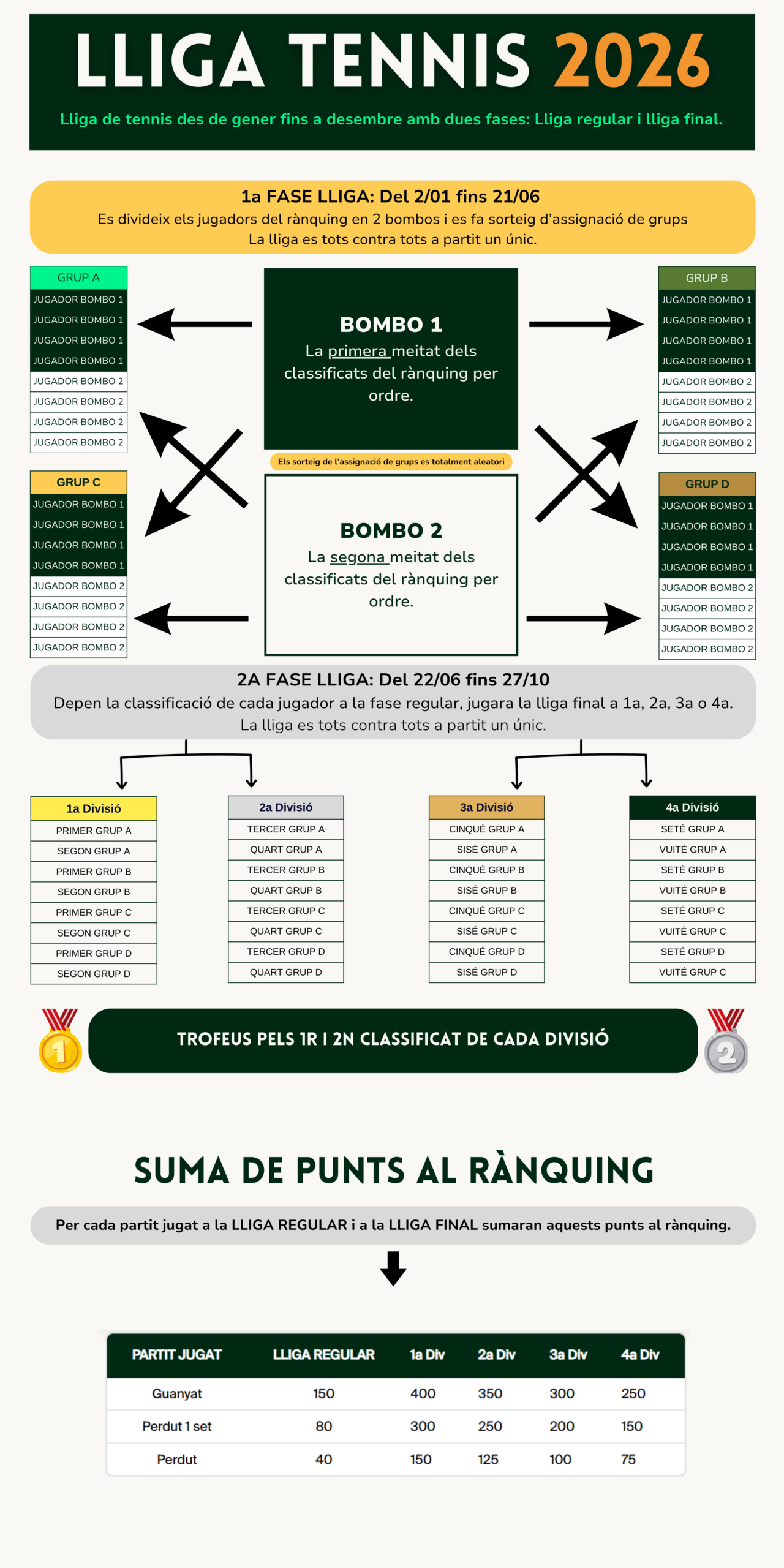 En finalitzar la 2A FASE – LLIGA FINAL es repartiran trofeus al 1r i 2n classificat de cada divisió.