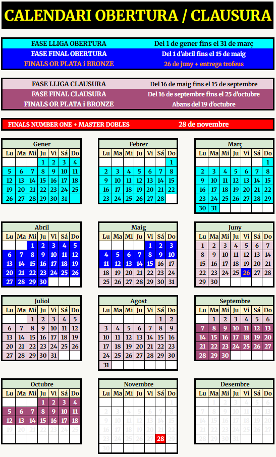 - No hi ha dia marcat per jugar els partits, es pot jugar durant el calendari indicat per la FASE LLIGA.