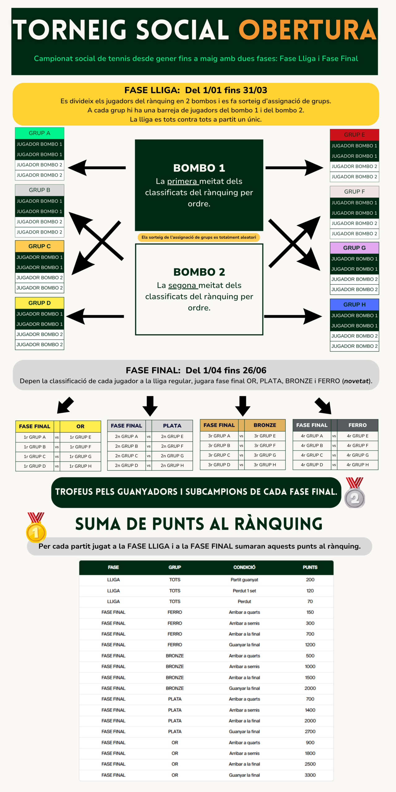 - 2FASE – FASE FINAL del 01/04 al 15/05 (La final es el 26/06): Quadres finals OR PLATA BRONZE i FERRO, depenent classificació a la fase lliga.