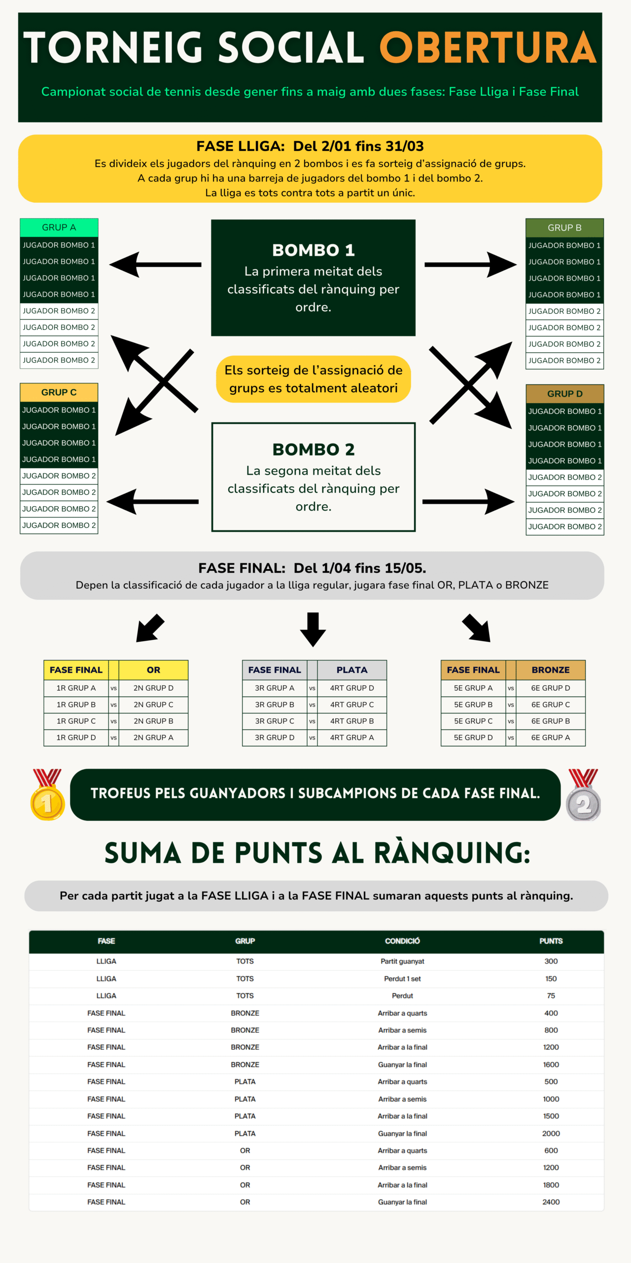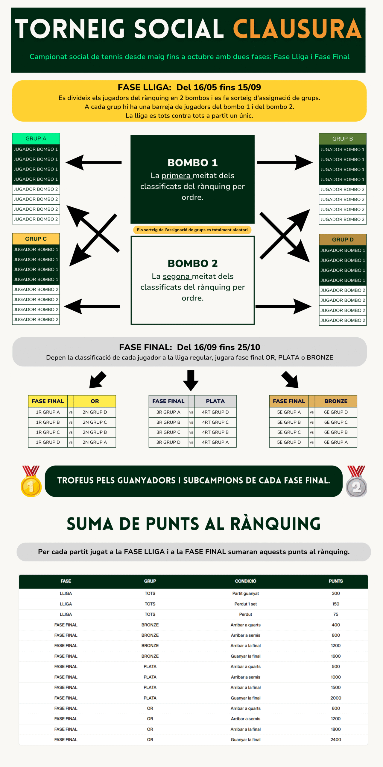 • FASE FINAL del 01/04 al 29/05: Quadres finals OR PLATA i BRONZE, depenent classificació a la fase lliga.