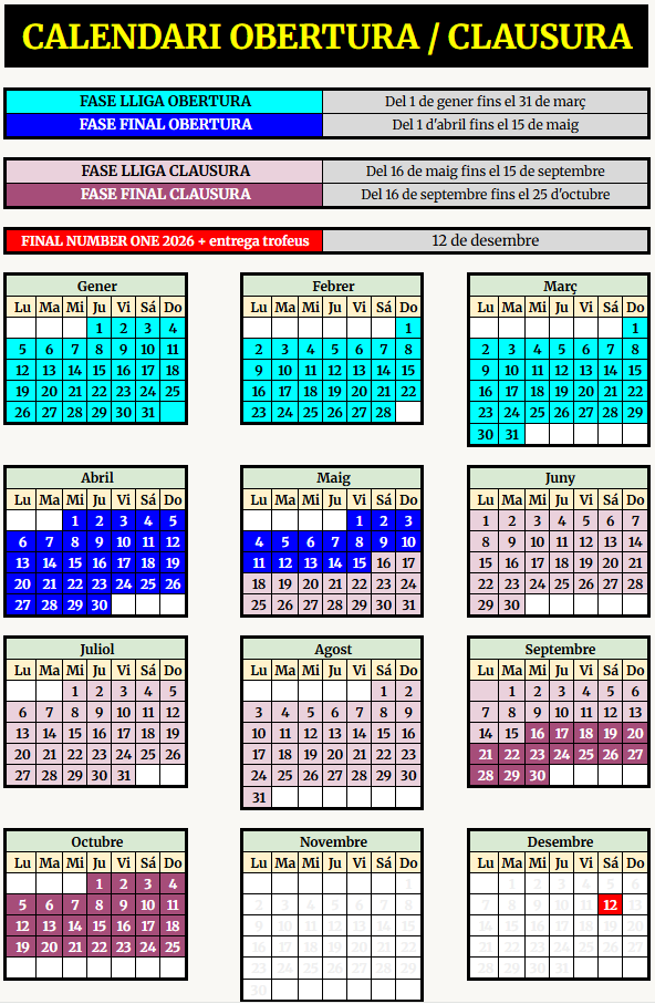 • FASE LLIGA del 01/01 al 31/03: Lliga amb sorteig aleatori de jugadors, tots contra tots i a partit únic.